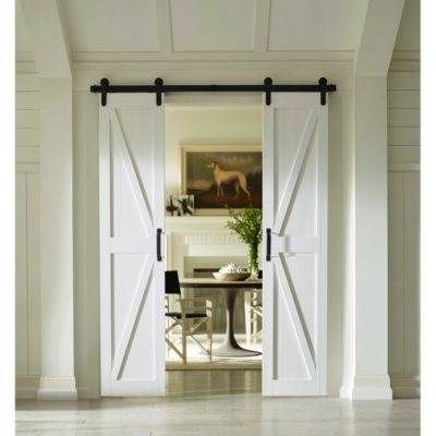 Install a barn door for a bathroom, closet or anywhere in you. The farm door tv console features dual farm door styled doors which slide upon an industrial steel track. And door openings up to 36'' wide. This one's 36x84, and made of solid wood and mdf which make it durable and easy to maintain. Millbrooke satin silver h style pvc vinyl ready to assemble barn door with sliding hardware kit barn doors add a unique focal point to any barn doors add a unique focal point to any interior.